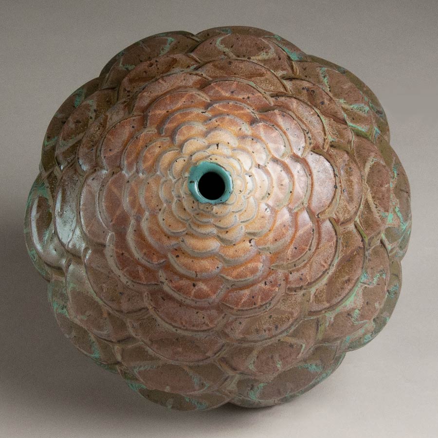 I’ve used this glaze combination before, but in this piece the glazing turned out especially well. The intentionally subtle glaze resist lines help to complicate the gaze runs and variations. Note the turquoise colors toward the bottom. The top glows like polished copper, and the turquoise runs in the lower half look like a copper patina.